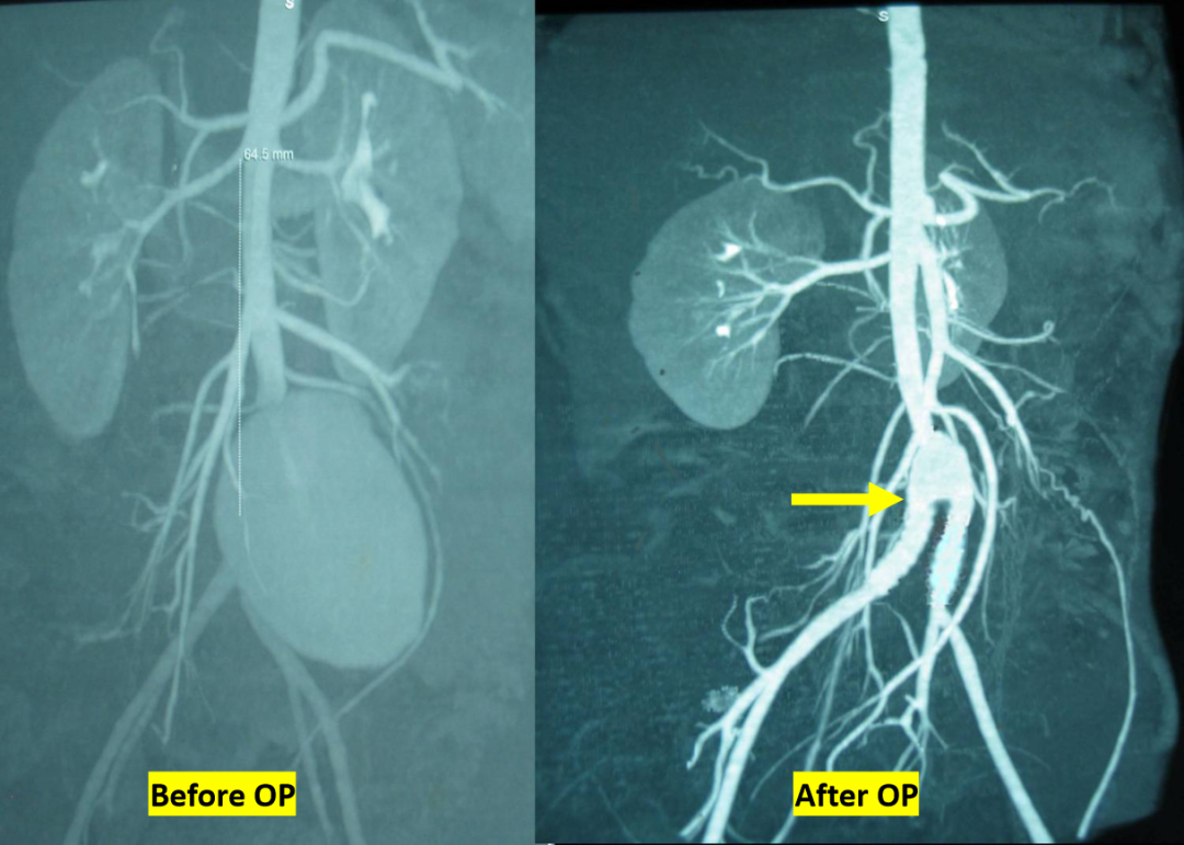 术前: 腹主动脉瘤最大横径8.9cm,双侧髂总动脉仅4mm。行腹主动脉瘤切除+Y型人工血管(12×6mm Dacron)植入术。