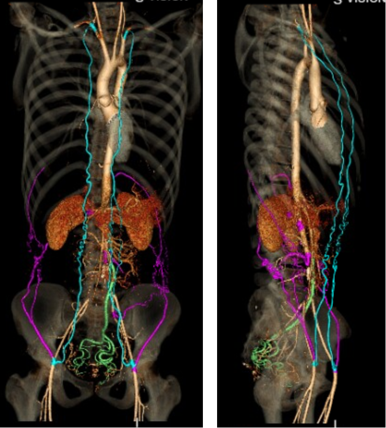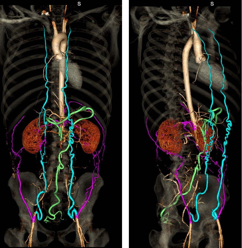 为了科学地解释为什么人工血管闭塞后下肢没有坏死,王深明教授团队联合生物力学专家,基于三位长期随访患者的CTA数据,构建了三维主动脉及侧支循环流体模型,进行了详细的计算流体力学(CFD)分析。