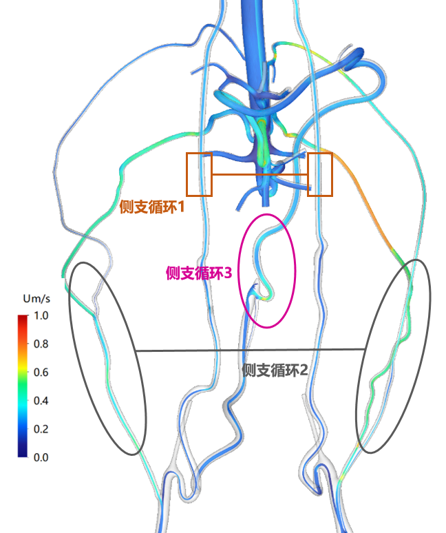 锁骨下-腹壁下通路: 压力云图显示,该通路的压降较大,尤其是左侧,提示血流阻力相对较高,可能与局部血管迂曲或狭窄有关。