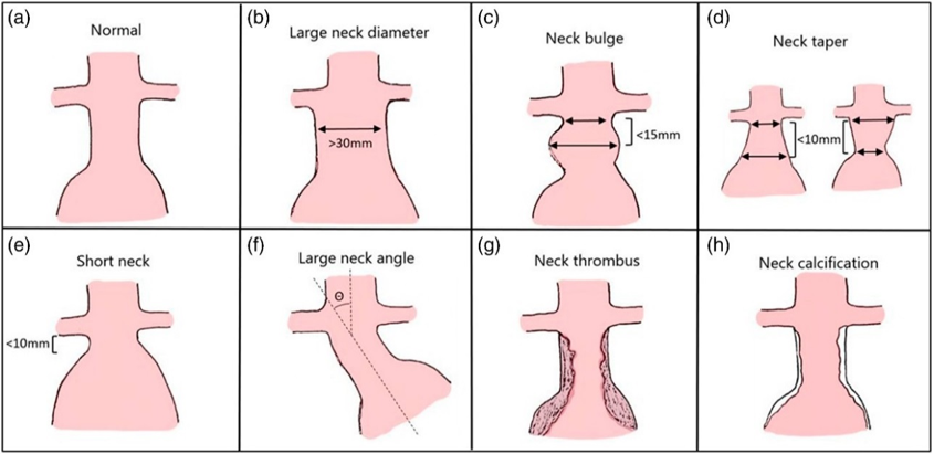 一个短小(<15mm)、锥形、成角大(>60°)或血栓化的瘤颈,预示着标准EVAR的高失败风险。