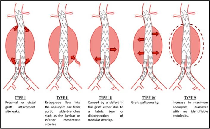 内漏: I型(锚定区)、II型(分支返流)、III型(组件连接处或破损)