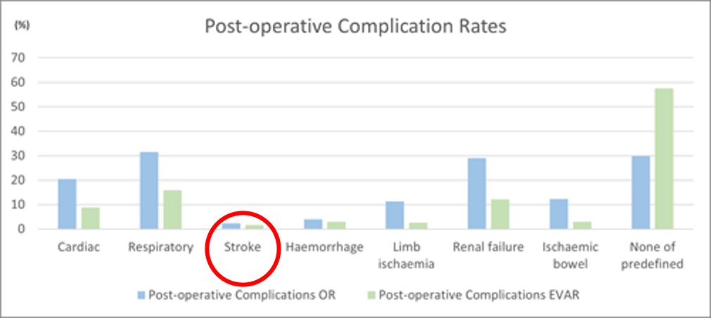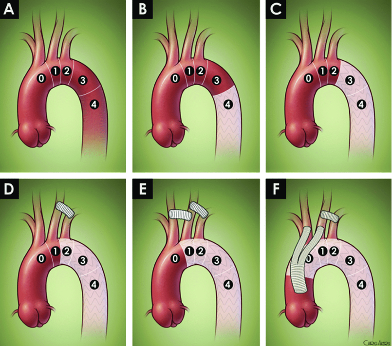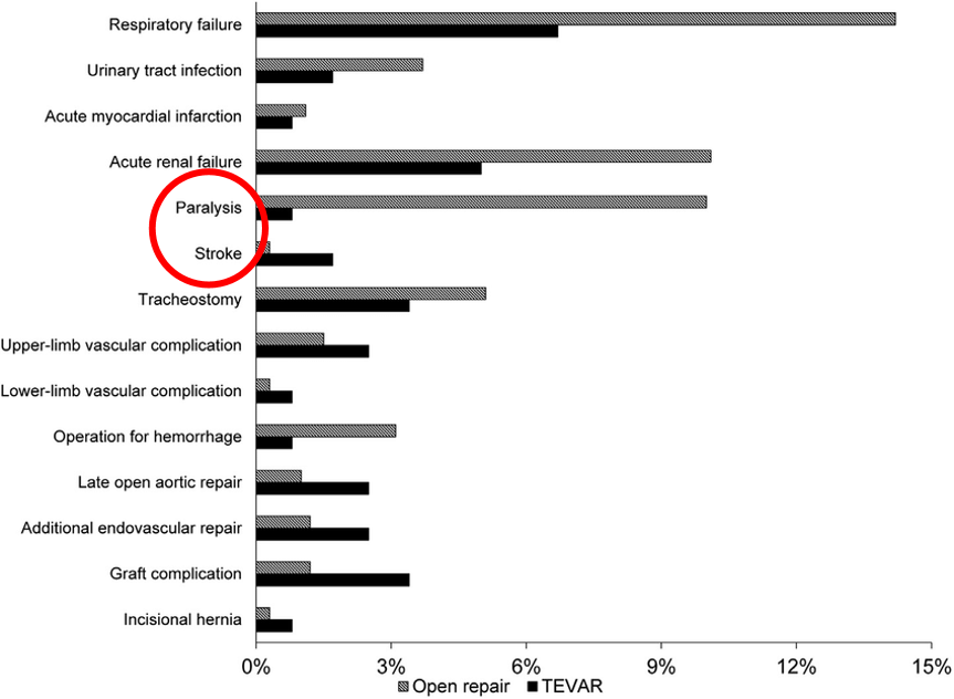 核心风险: 卒中、脊髓缺血(SCI)和死亡率显著高于腹主动脉手术。数据显示,弓部TEVAR的卒中率可高达20%,SCI率可达3.1%,围手术期死亡率亦可高达13.2%。