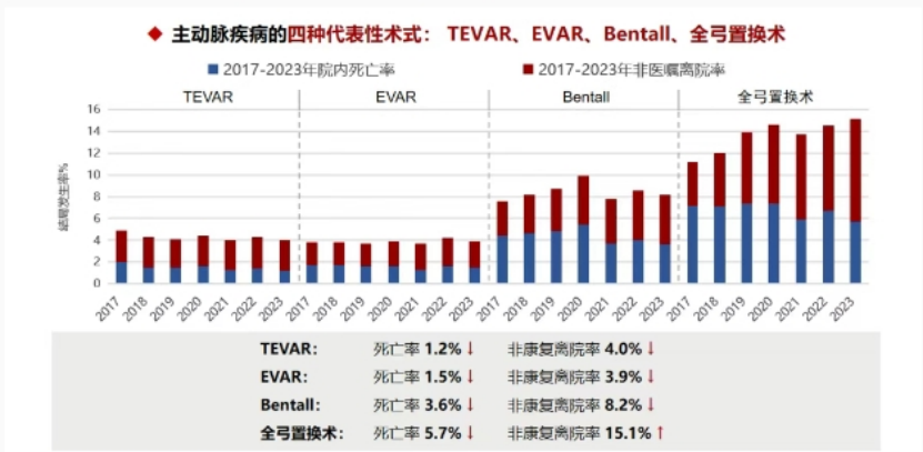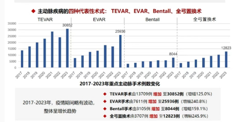 根据2024年中国主动脉基本医疗质量报告,近五年来TEVAR手术应用呈现快速增长趋势。这一微创治疗方式以其相对较低的围手术期死亡率和较快的术后恢复速度,在主动脉疾病治疗领域占据了重要地位。