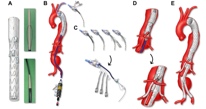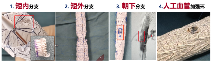 短内分支;短外分支;朝下分支;也可以选择人工血管加强环: 在分支开口处缝合一段人工血管,形成“烟囱”或“裙边”,能有效预防I型内漏,尤其适用于夹层或贴壁不良的情况。