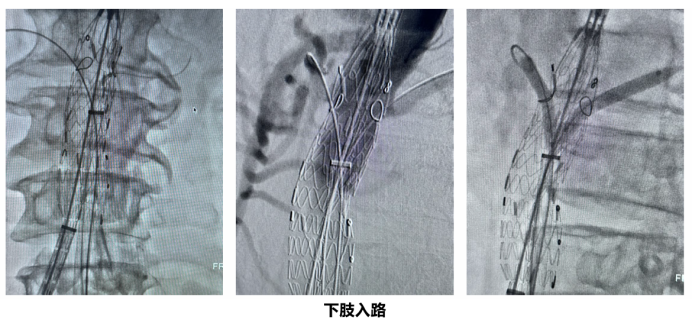 在一例胸腹主动脉瘤手术中,发生了罕见的“束径丢失”(束径导丝意外脱出),导致支架提前贴壁。面对危机,团队并未慌乱,而是迅速采取补救措施: