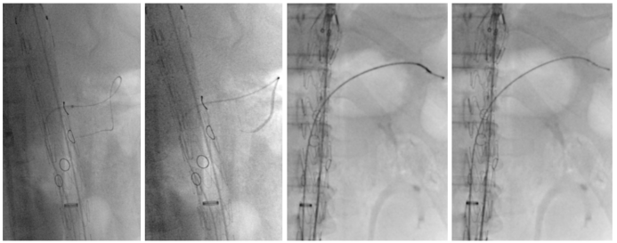 球囊固定与释放: 四分支均植入球囊并充盈固定后,再释放主体支架的束径装置,完成最终释放,最后植入桥接支架。