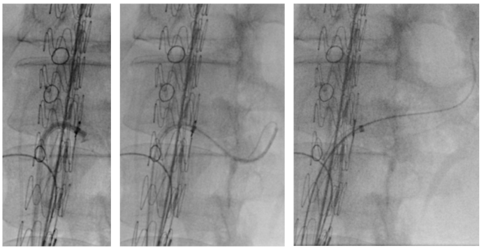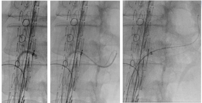 导管先行: 超选进入分支后,先置入导管而非硬导丝。硬导丝会将支架与分支“刚性”固定,丧失调整能力。待四个分支均被导管标记后,再逐一交换为硬导丝,此时支架位置已基本锁定,稳定性极佳。