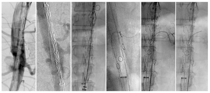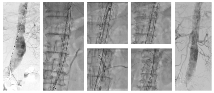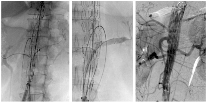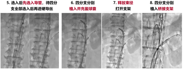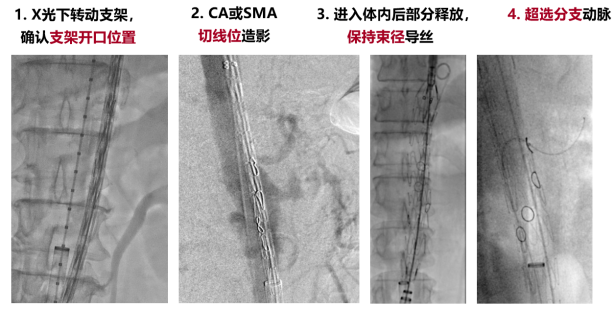 精确定位: 在X光下旋转主体支架,结合CA/SMA切线位造影,确保四个开窗/分支精确对准目标血管。