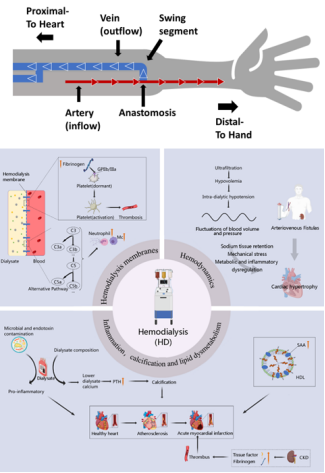 血流动力学紊乱: AVF建立后静脉系统会暴露于动脉压力和流速,导致血流剪切力增加,导致静脉血管腔扩大,引起AVF高流量-管腔扩张正反馈;AVF高血流量导致容量超负荷会导致肺动脉高压、心脏肥大、射血分数下降,最终导致心力衰竭。