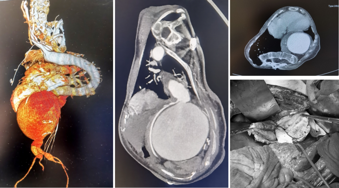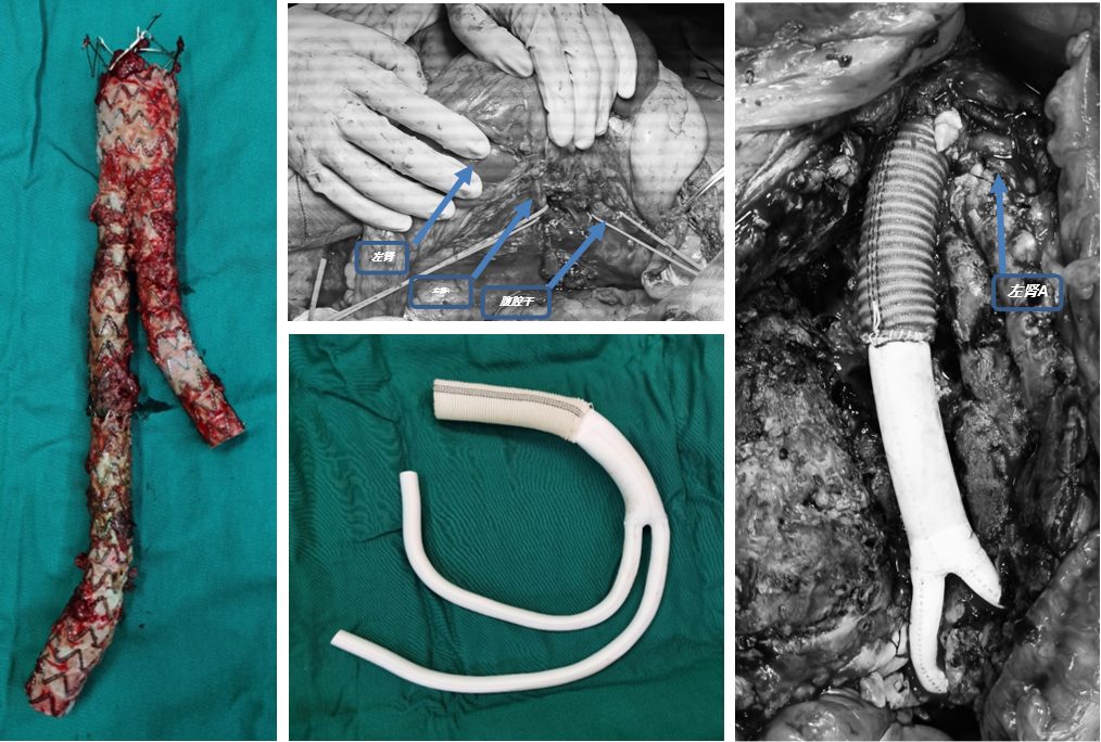 治疗决策:患者年轻,已出现先兆破裂征象,且支架近远端均存在内漏,主动脉仍在继续扩张。单纯腔内再干预难以解决整个病变主动脉的脆弱性,因此我们选择胸腹联合切口行胸腹主动脉瘤切除+人工血管置换+腹主动脉瘤内覆膜支架异物取出术。术中见支架已脱入瘤腔,主动脉壁薄弱。