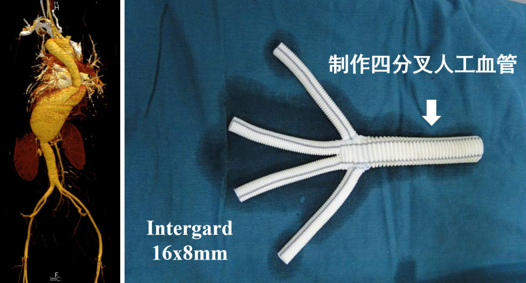 病例3:主动脉弓部置换+降主动脉象鼻术支架置入术后22天,夹层TAAA累及双髂总起始;入路:双髂总远端。