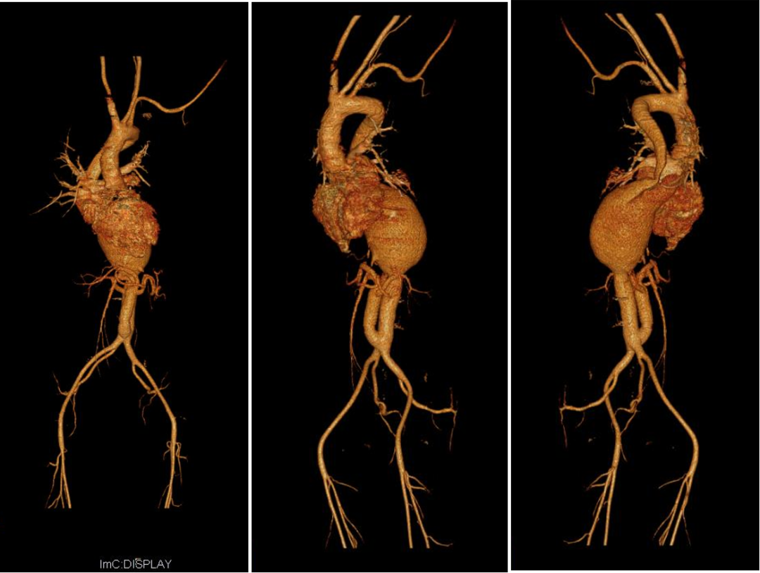 病例二:近肾腹主动脉瘤伴脊柱侧弯,开腹行腹主动脉瘤切除伴人工血管置换术。