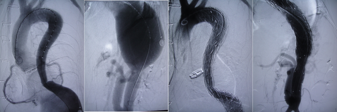 二期(术后第7天)经股动脉置入胸主动脉覆膜支架,锚定于人工血管远端。