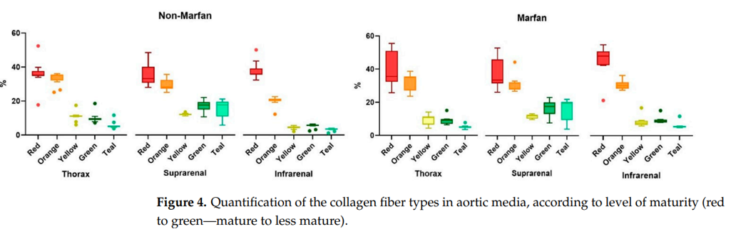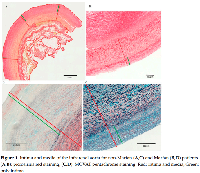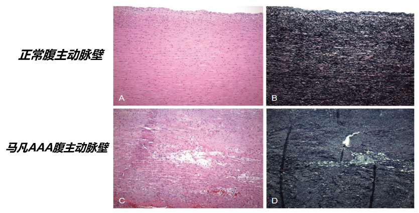 MFS由15q21.1位点FBN1基因突变导致,原纤蛋白-1异常使结缔组织强度下降,主动脉壁弹性蛋白含量降低、弹性纤维断裂。肾下腹主动脉段胶原合成显著低于非MFS患者,因此该段主动脉壁更加薄弱。这解释了为何MFS患者单纯肾下AAA发病率较低,而病变多累及根部、降主动脉和胸腹主动脉。
