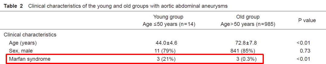 日本单中心999例AAA患者中仅6例为MFS(0.6%),但在<50岁AAA患者中MFS占21%(3/14)(Nakano M et al. Ann Vasc Dis 2017)。因此,对于年轻AAA患者需警惕MFS可能。