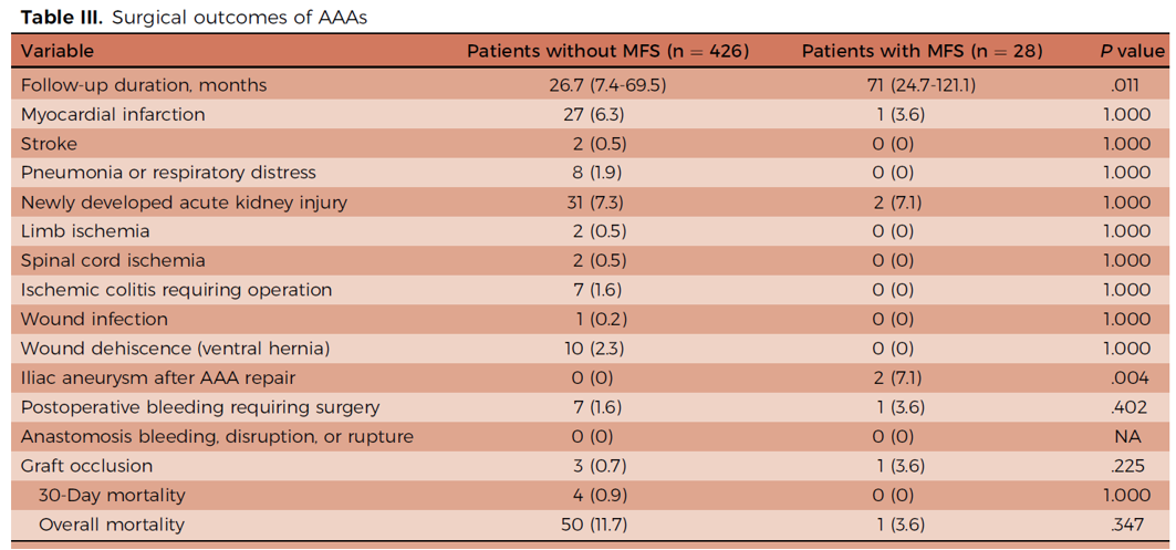 韩国三星医疗中心对比28例MFS-AAA与425例普通AAA开放手术,中位随访71个月,两组并发症、30天死亡率、总体死亡率无显著差异(除髂动脉瘤)(Kang J et al. J Vasc Surg 2021)。