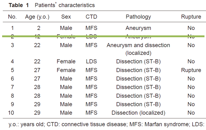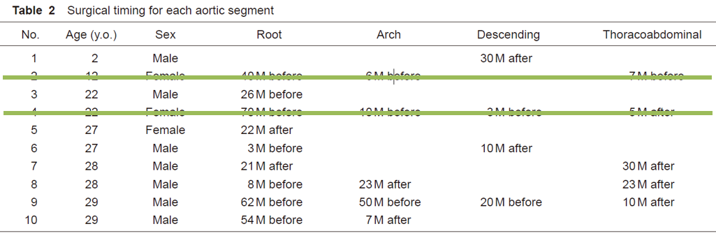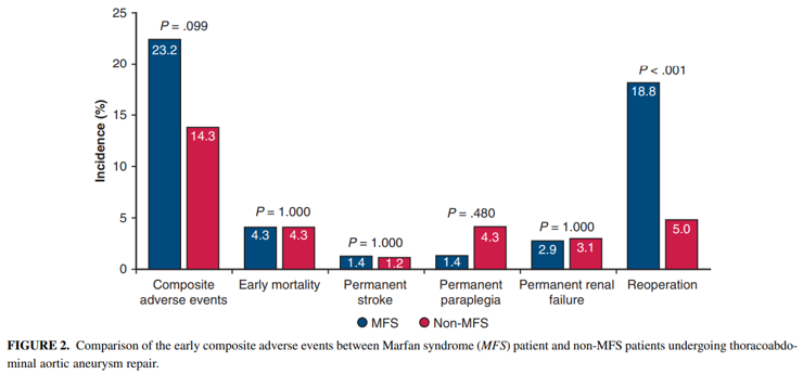 日本多中心8例<30岁MFS-AAA开放手术,无围术期死亡,中位随访94月无手术相关再干预,但7例需其他部位再干预,根部2例,弓部2例,降主动脉2例,胸腹主动脉3例。(Matsuo J et al. Ann Vasc Dis 2019)。