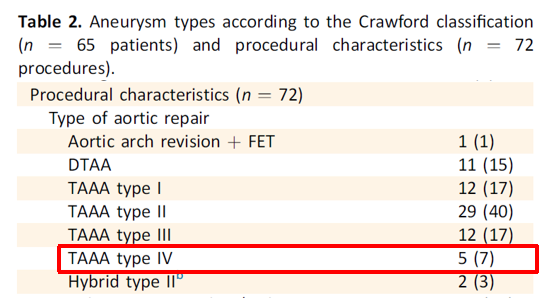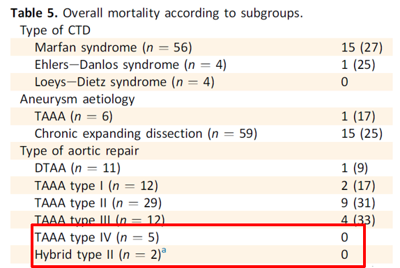 希腊多中心65例MFS-TAAA开放手术中,5例Ⅳ型(腹主动脉瘤)开放手术和2例杂交手术死亡率均为0%(Keschenau PR et al. Eur J Vasc Endovasc Surg 2017)。