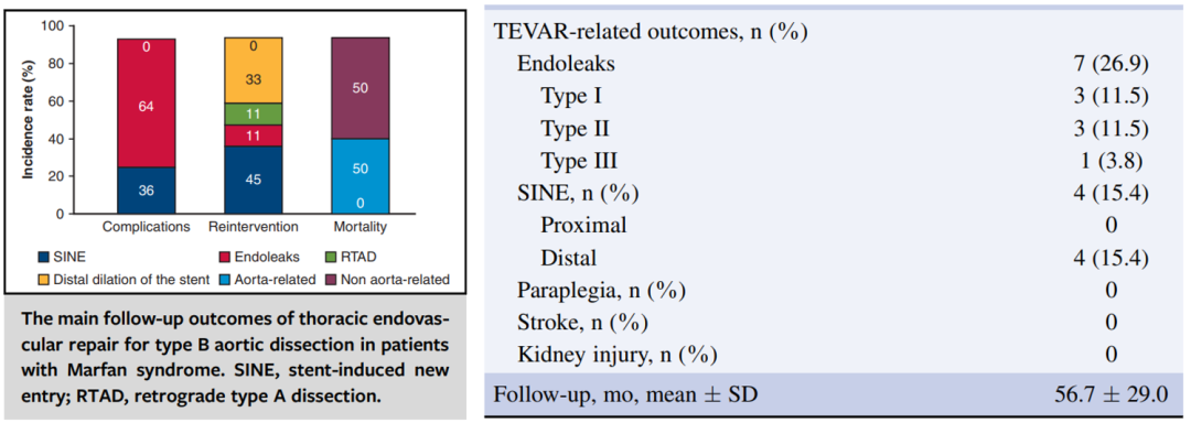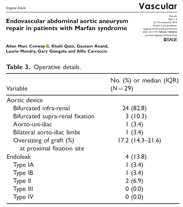 Conway等分析美国血管质量注册中心29例MFS-EVAR,30天死亡率3.4%,再干预率6.9%,中位随访766天无内漏或再干预,但失访率达48.3%(14/29)(Conway AM et al. Vascular 2020)。该研究随访时间短,无法评估远期效果。