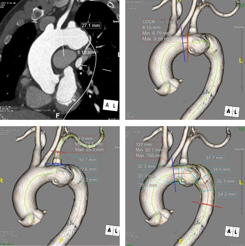 患者资料:男性,57岁,因“胸闷、胸痛5月余,加重1周”入院。CTA提示主动脉弓下缘动脉瘤伴局限性穿透性溃疡,病变紧贴左锁骨下动脉前缘,但左颈总动脉后缘至左锁骨下动脉后缘距离足够(锚定区充足)。