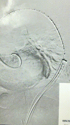 使用65 cm长鞘顺利通过扭曲段,避免与近端支架输送过程发生剐蹭。