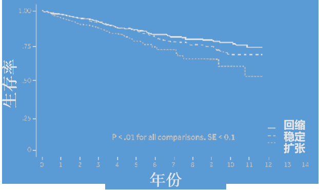 大量研究证实,仅仅维持瘤囊不扩张是远远不够的,瘤囊回缩才是更好的结果。一项纳入1,450名患者的随访研究显示,瘤囊回缩组患者的长期生存率显著高于对照组(3年:84.1% vs. 77.8%;10年:53% vs. 38.1%)。另一项涵盖17,099名患者的荟萃分析更是明确指出,瘤囊回缩患者的全因死亡率明显低于瘤囊稳定或扩张的患者(HR 0.73)。此外,回缩还带来了更低的二次干预率、更少的远期内漏发生率和极低的植入后破裂风险。