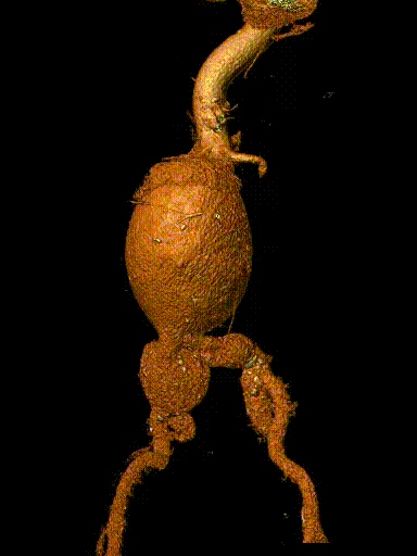案例四(梯形瘤颈):因下肢髋部疼痛行腰椎检查时发现腹主动脉瘤,进一步CTA认证确诊为腹主动脉瘤。