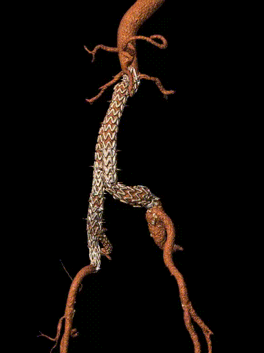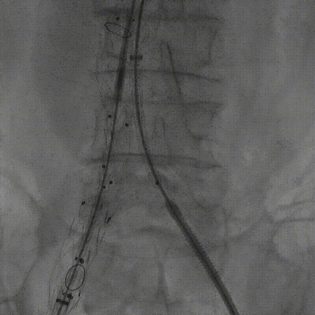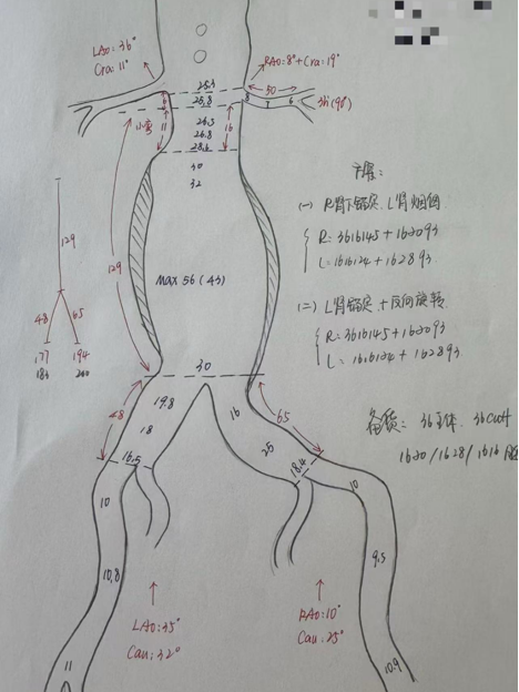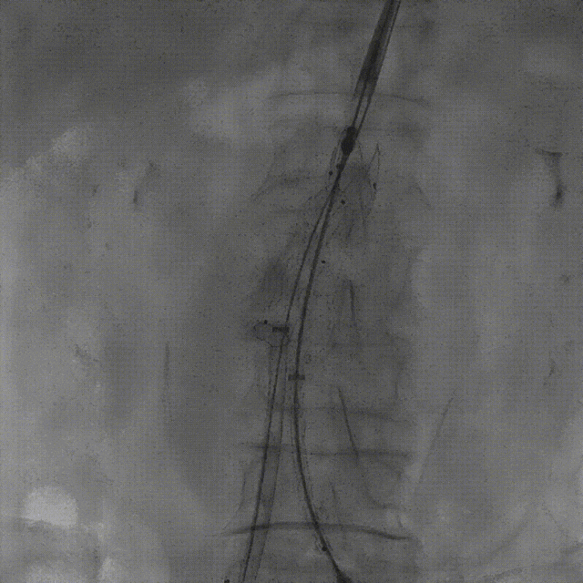 案例一(巨大成角瘤颈):患者瘤颈虽长但呈90度成角。在完成髂动脉重建后,采用Reverse技术释放主体支架。术中造影显示,支架完美贴合扭曲的血管大弯侧,术后一月复查CTA,原有的少量内漏已完全消失。